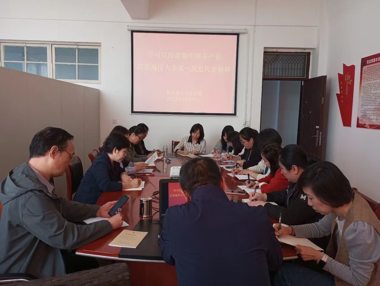 10月18日下午,机关第十九党支部开展主题党日活动并召开教职工大会,专题传达学习学校第一次党代会精神。会议由党支部书记于雪梅主持,学术期刊社、教学质量管理处、教师教学发展中心全体教职工参加。